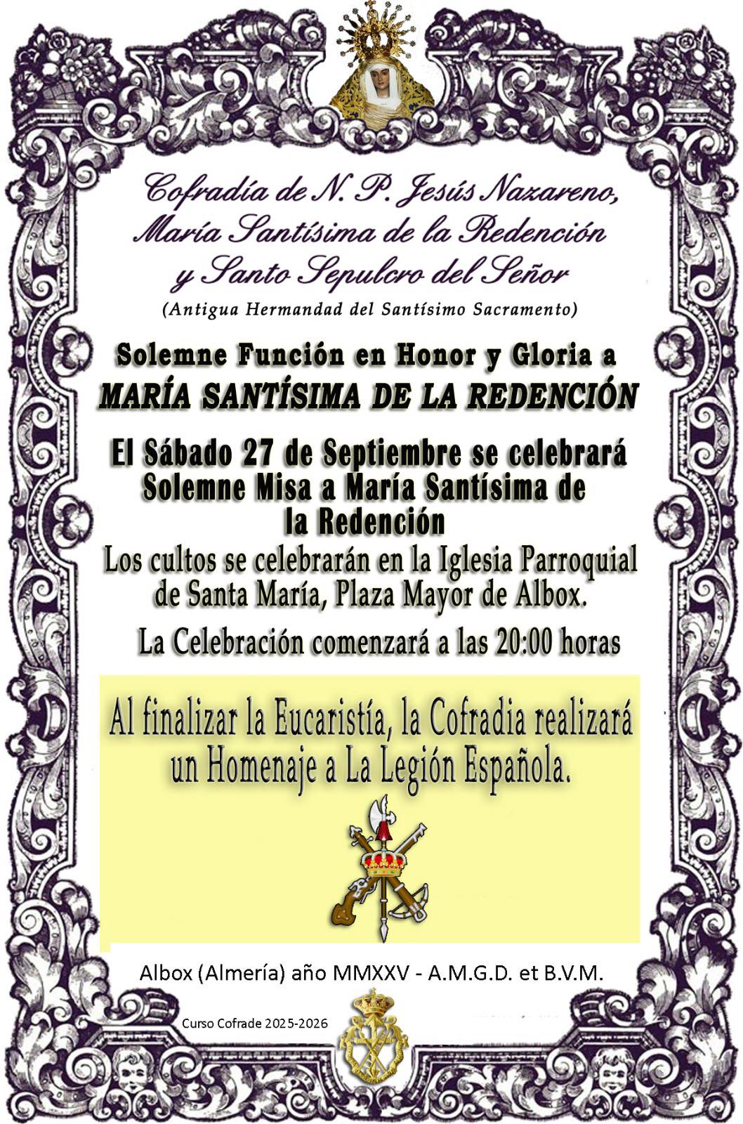 La Sagrada Imagen de María Santísima Redención quedó expuesta en el centro del Altar Mayor del Templo Parroquial como símbolo del inicio del Curso Cofrade 2025-2026. Don Antonio Jesús Saldaña Martínez, Párroco de Santa María, a las 20:00 horas celebró la Santa Misa en su Honor y seguidamente se tributó un Homenaje al Tercio D. Juan de Austria, III de la Legión, que tiene su sede en la Base Álvarez de Sotomayor de Viator (Almería), presente en el acto.