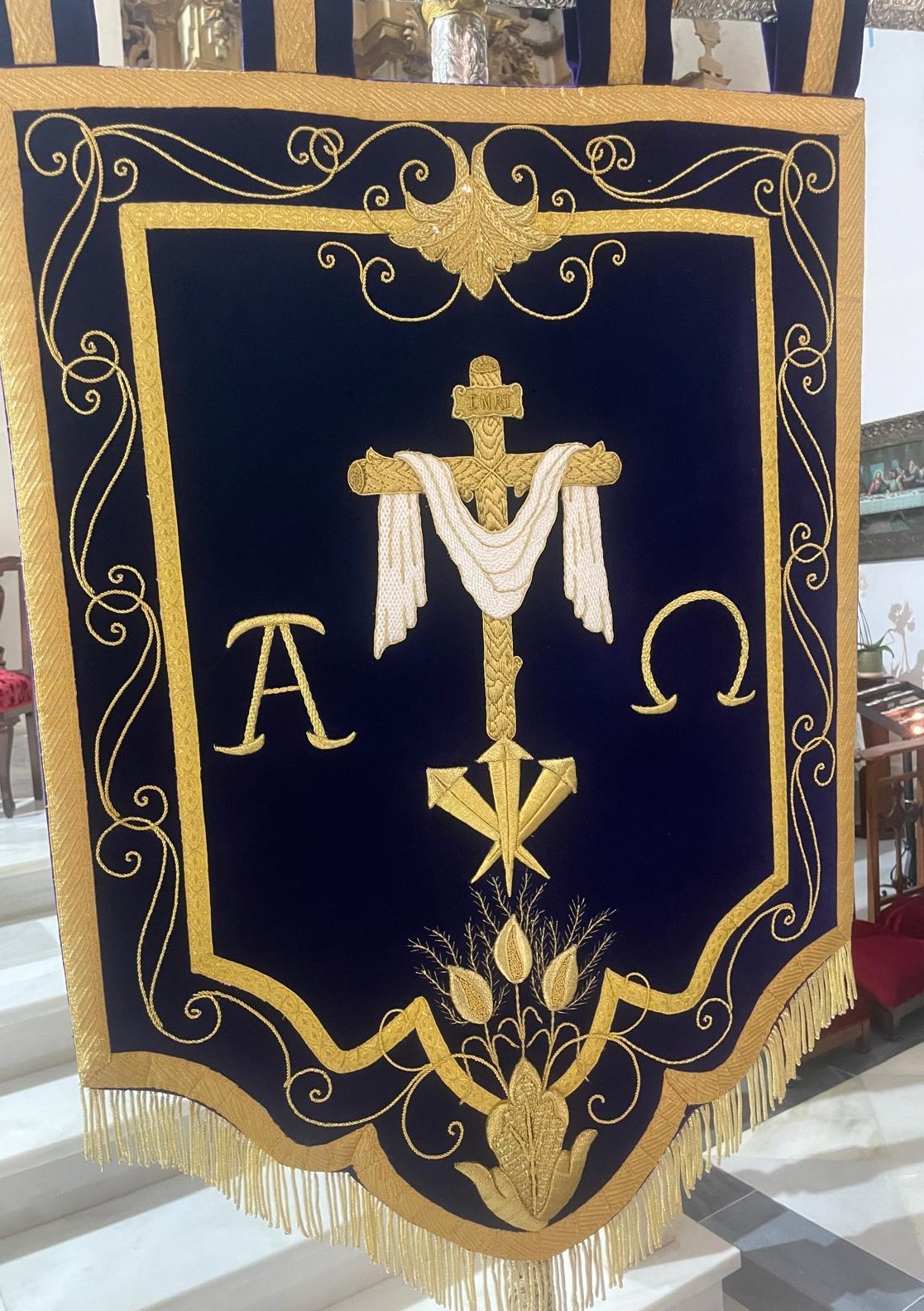 colocados cuatro varales o brazos. El palio y las bambalinas se confeccionaron en terciopelo de color azul, y fueron bordados en oro con dibujos y motivos marianos, por Sor Concepción Montero de las Monjas Adoratrices. En 1998 se retocaron ligeramente las bambalinas para mejorar la estética del conjunto. En 2002, se dotó al trono de la Virgen de dos esplendorosos candelabros de cola, realizados en los talleres de Motril, contribuyendo a perfeccionar esta obra que como todas las de su género nunca se da por terminada. En 2009 se le colocaron 26 candeleros y 8 jarras como primera fase de la nueva Candelería realizada en Sevilla en la Orfebrería Hijo de Juan Fernández por encargo de la Hermandad. En 2010 se completó toda la Candelería que consta de 64 candeleros, 8 jarras y 8 violeteras, distribuidas de forma escalonada por tamaños, elaborados en metal plateado, repujados a mano. TRONO DEL SEPULCRO.